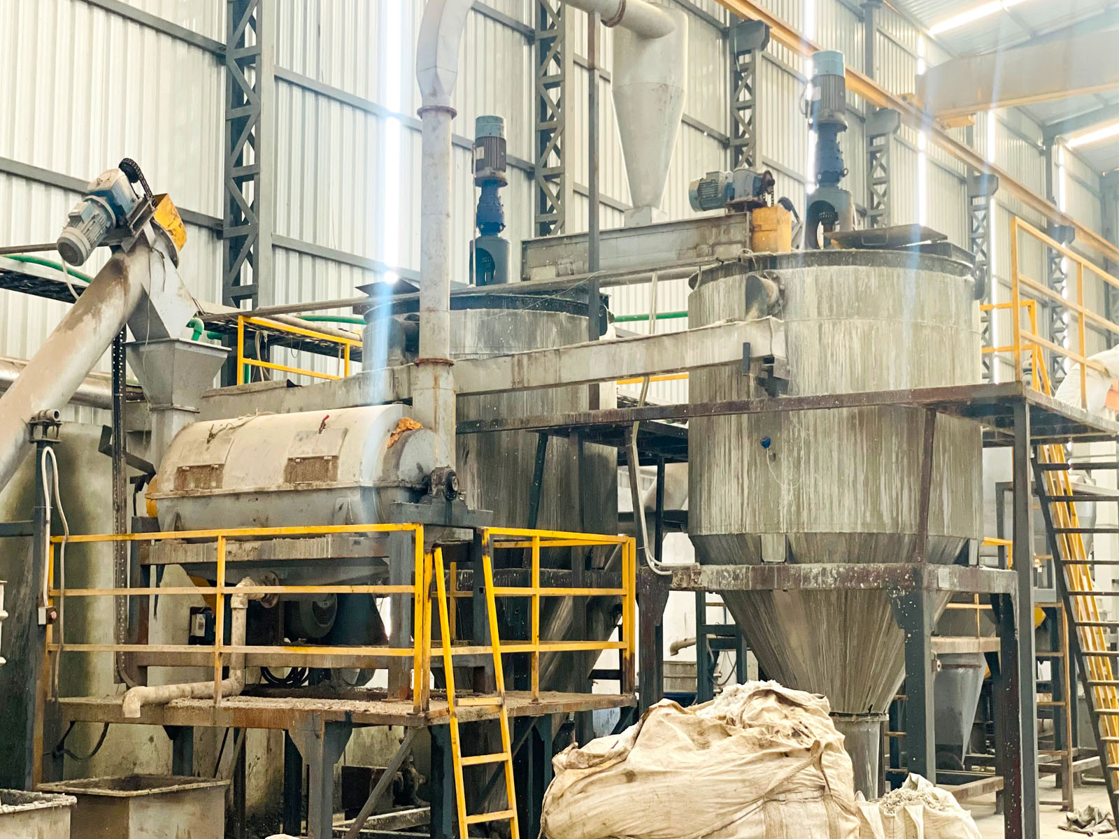 Flakes are washed at 85–95°C with caustic solution to remove glue, oil, and organic impurities.
